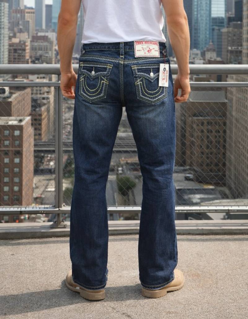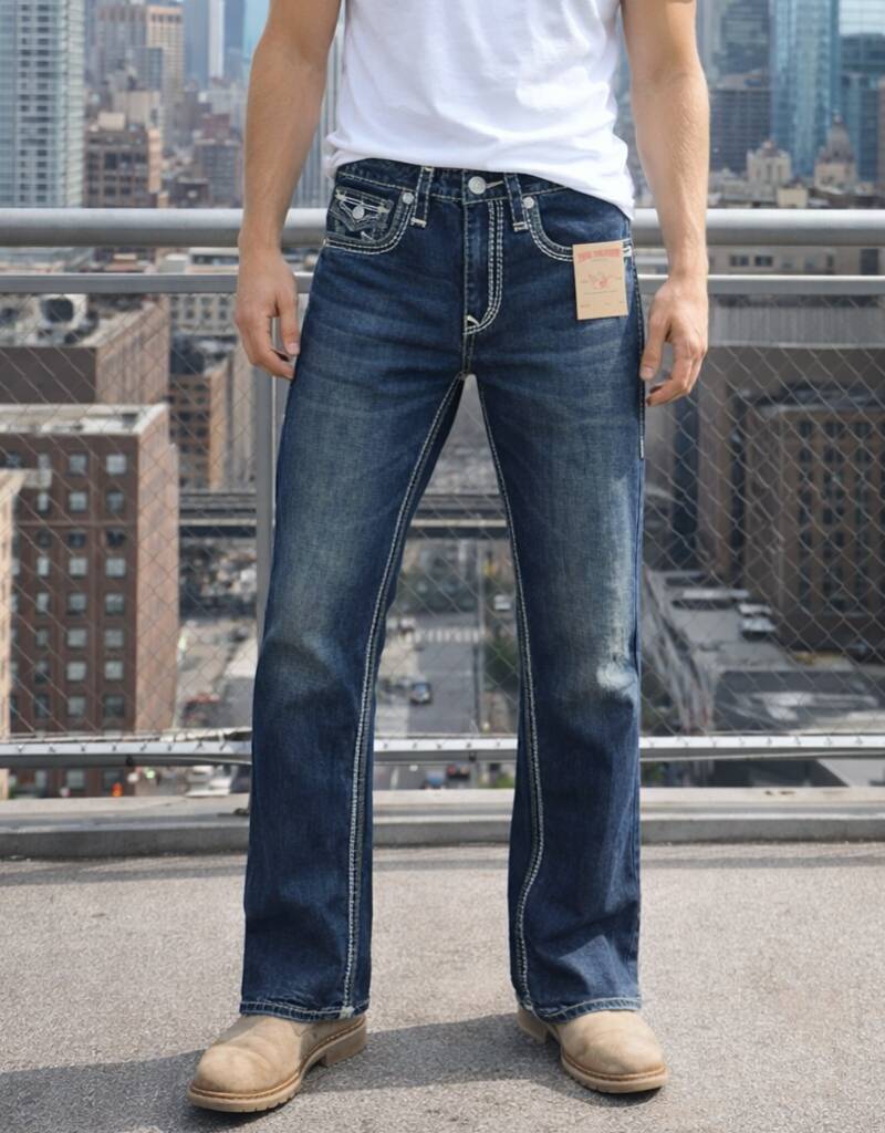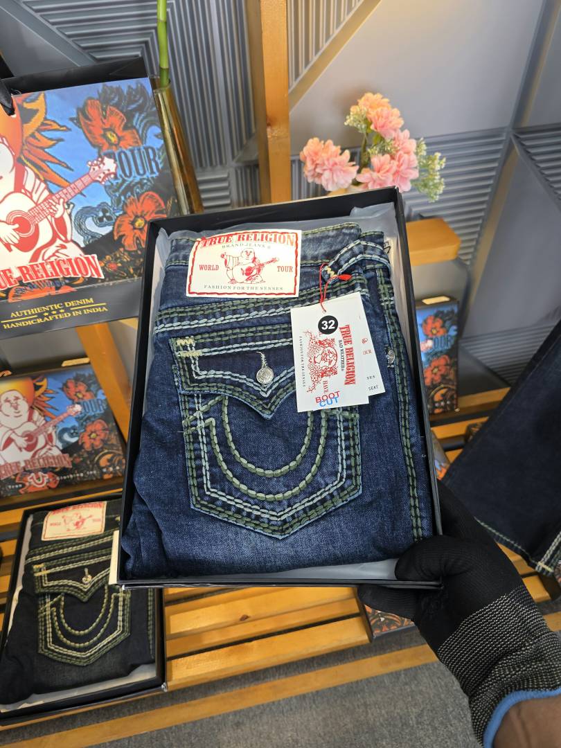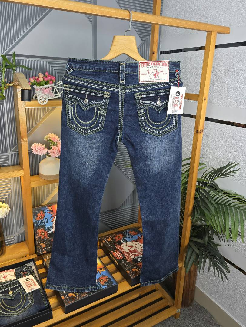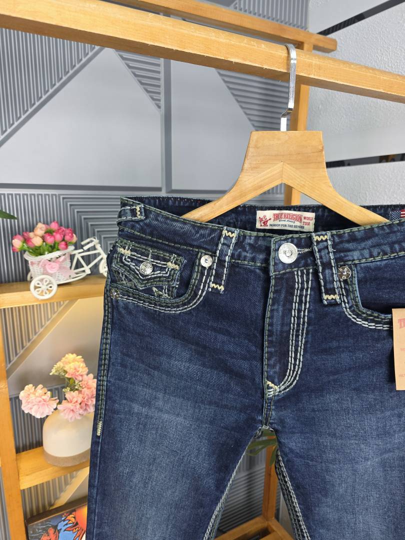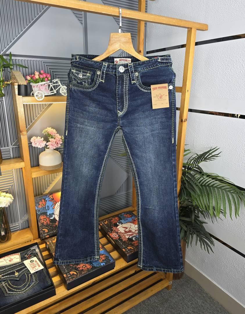 True Religio n Dark Shade Premium Imported Stretchable Lycra Fabric Boot Cut Back Flap pocket Design Denim with Brand Box and Carry Bag 3550