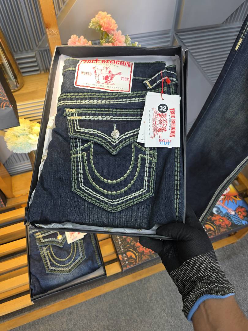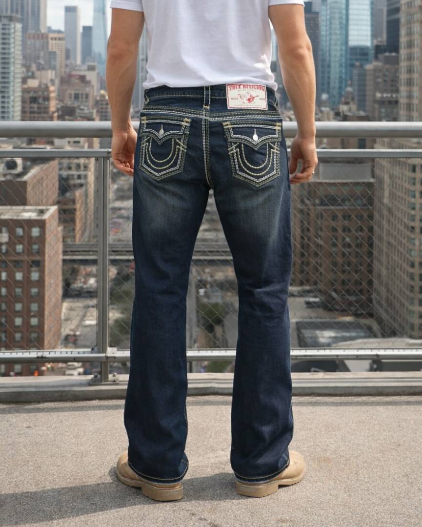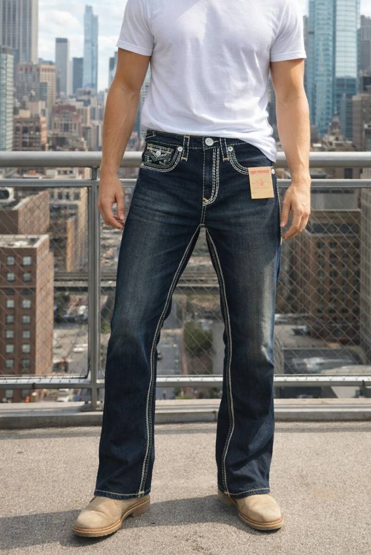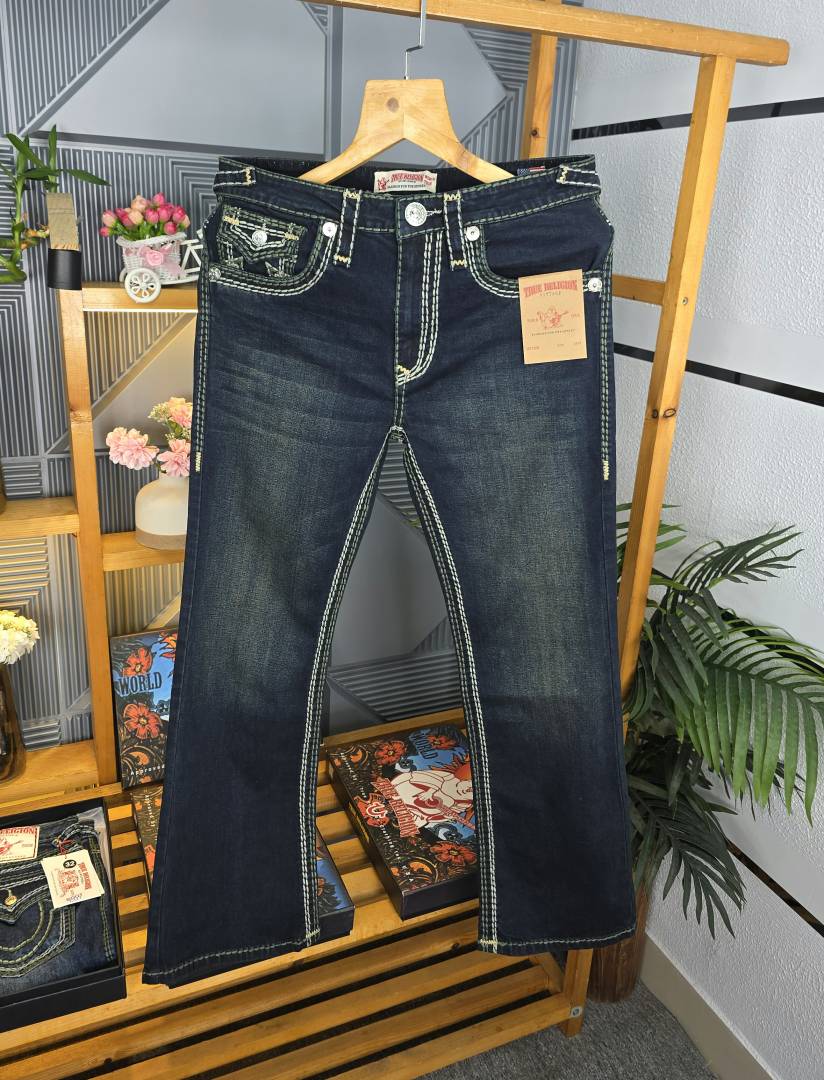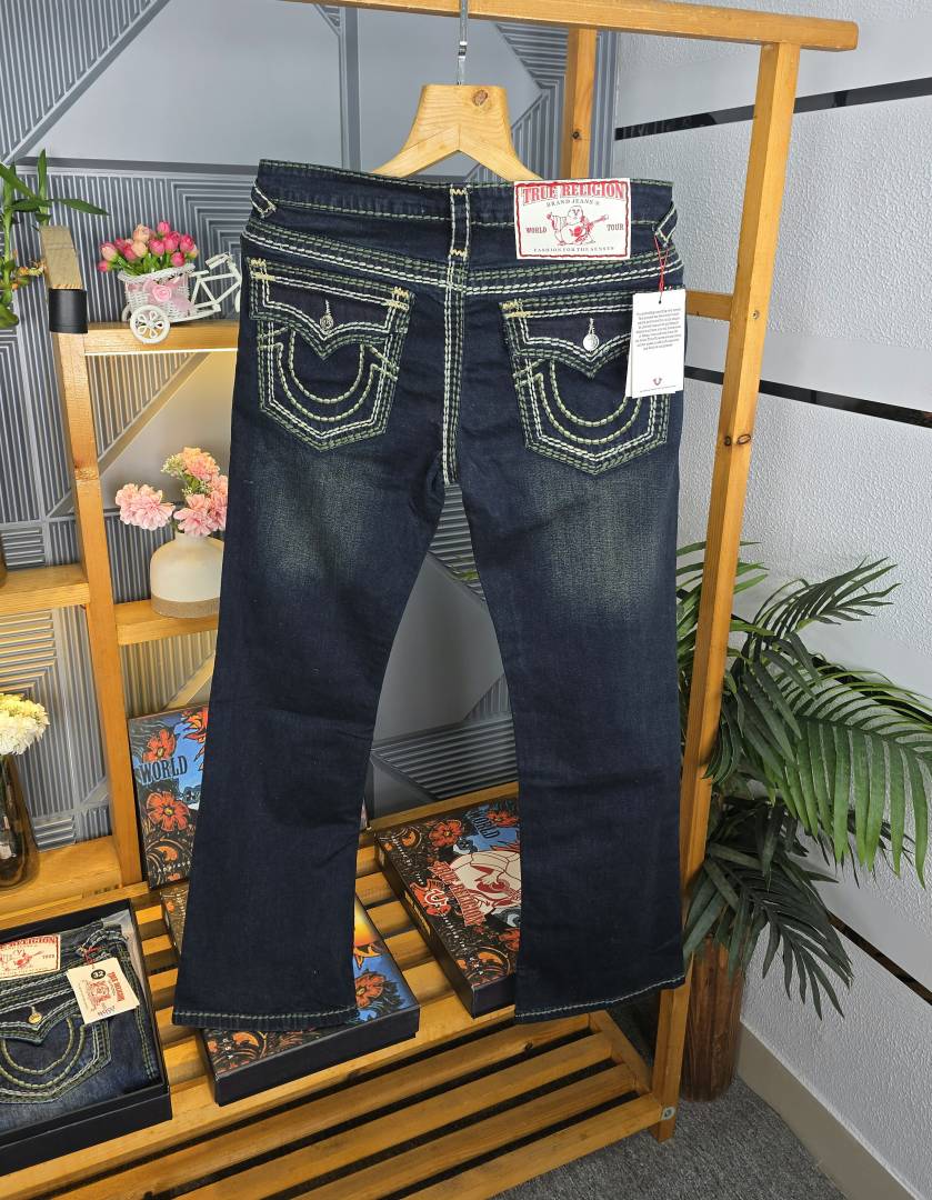 True Religio n Dark Shade Premium Imported Stretchable Lycra Fabric Boot Cut Back Flap pocket Design Denim with Brand Box and Carry Bag 3550